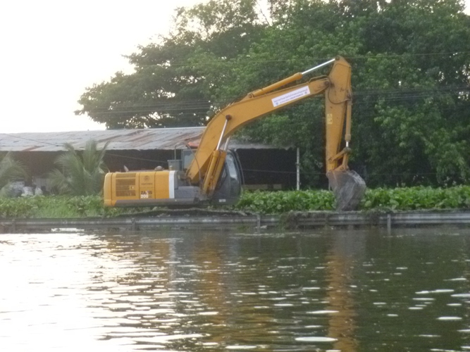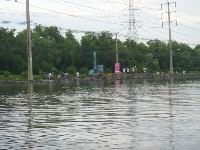 แบล็กโฮกำลังทำลายคันกันน้ำ ที่เพิ่งทำออก เพราะน้ำทะลักเข้าฝั่งกทมฯ อย่างเดียว...