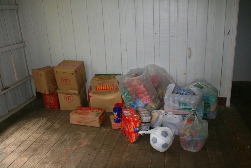 ในกล่องคือของที่มอบให้เจ้าหน้าที่ และขนมอุปกรณ์กีฬาฝากไว้ให้นักเรียน เนื่องจากทำถนนเข้าไม่ได้