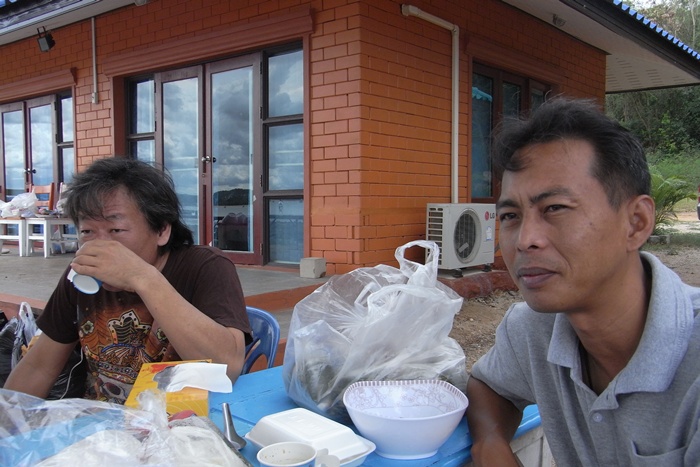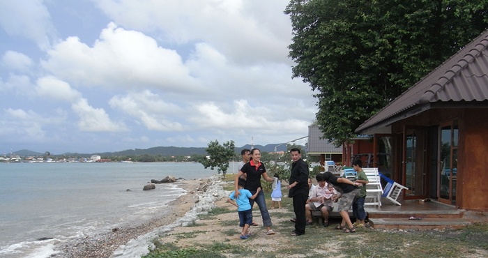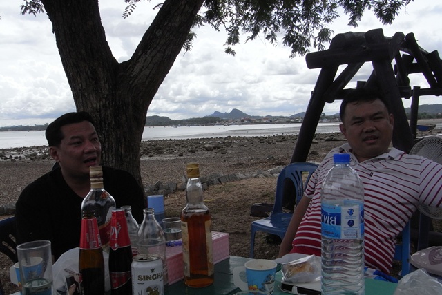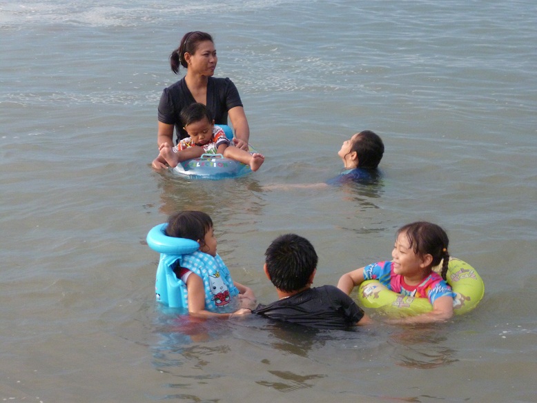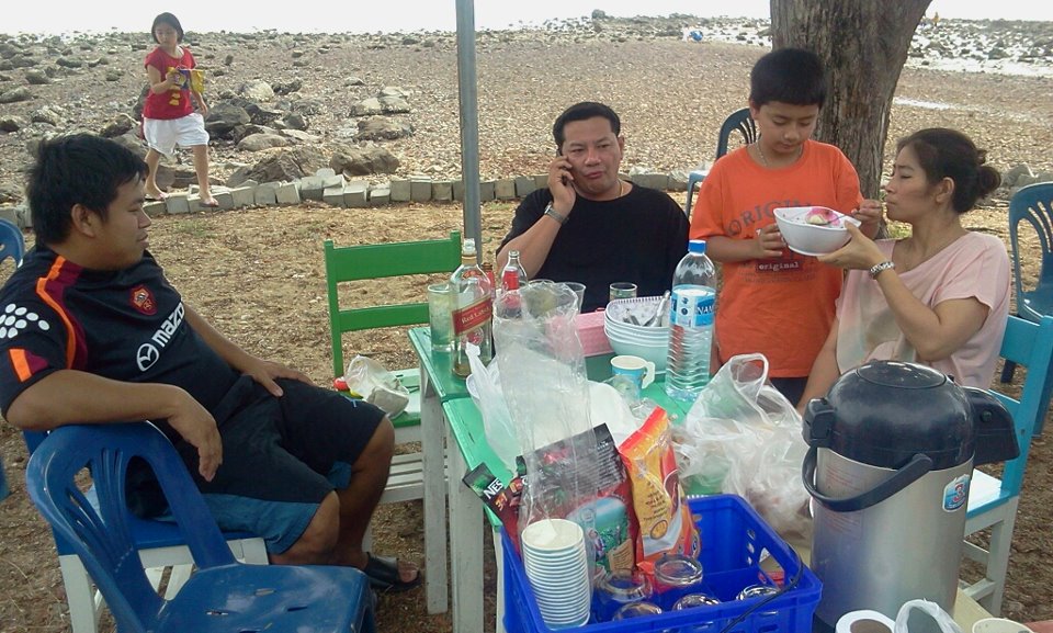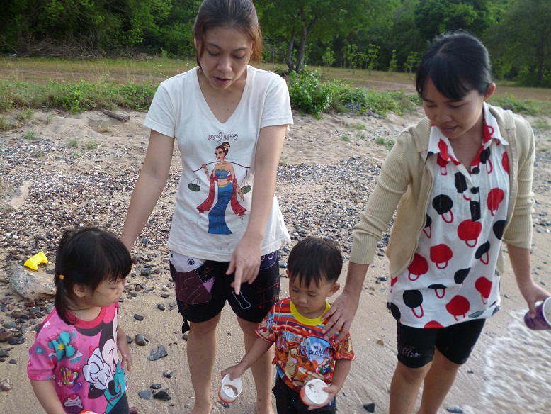 ตัวเล็กๆ ที่ยังไม่กล้าลงน้ำ ก็เล่นทรายไปพลางๆ โดยมีแม่บ้านคอยดูไกล้ๆ ส่วนพ่อบ้านก็โจ้เหล้าเคล้าคาราโอเกะ