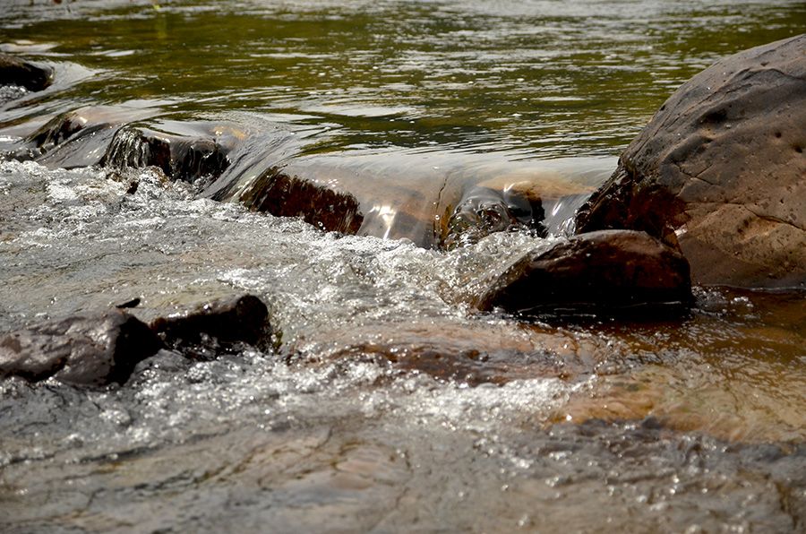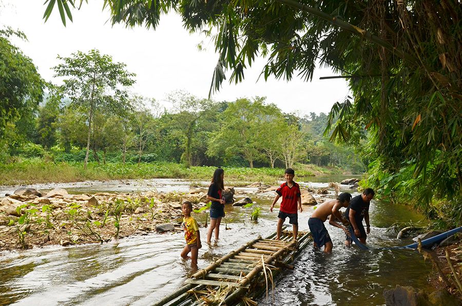 โหน่งได้ทีเอาหัวสูบน้ำวางในลำธารเสร็จเลยเล่นน้ำเลย
