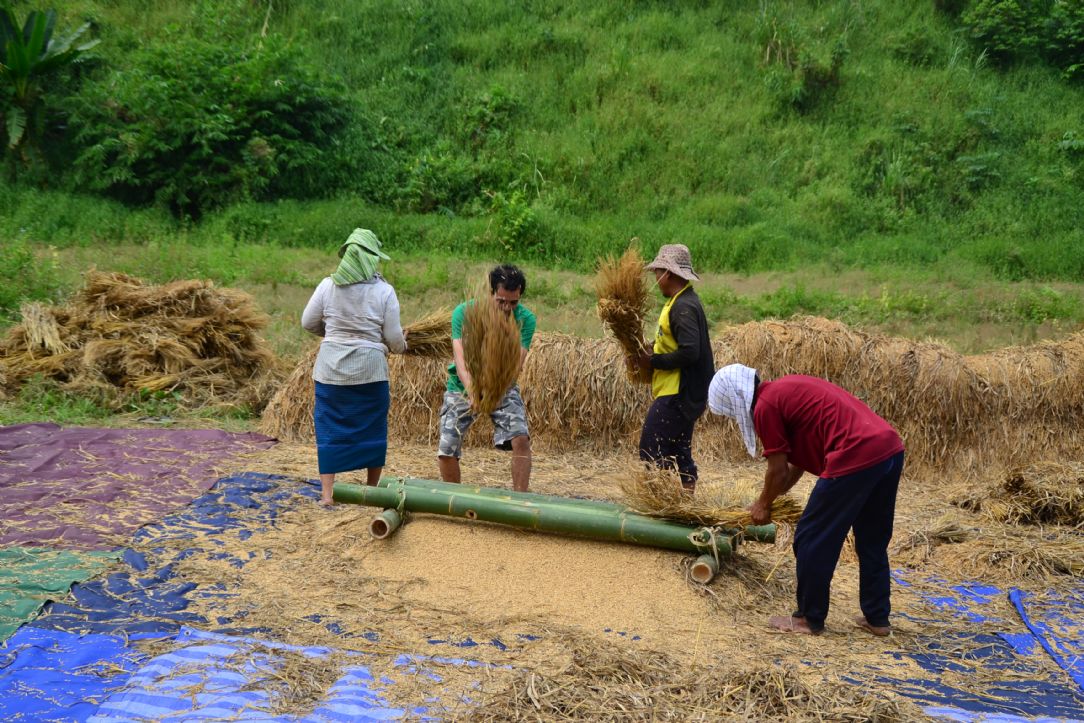 ก่อนถึงแวะช่วยชาวบ้านฟาดข้าวนิดหน่อย