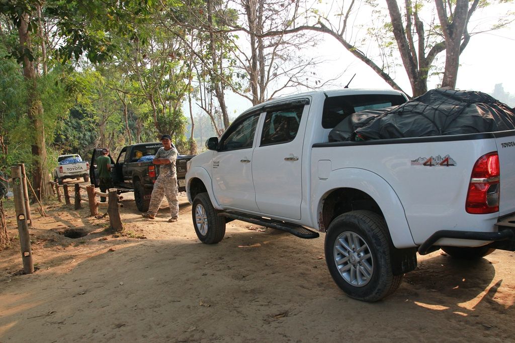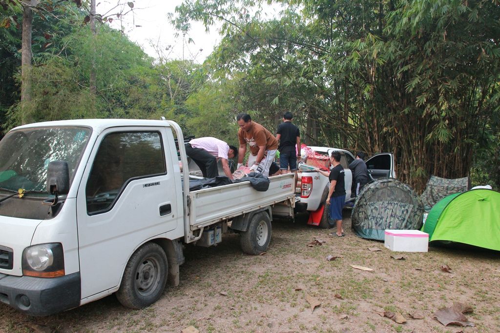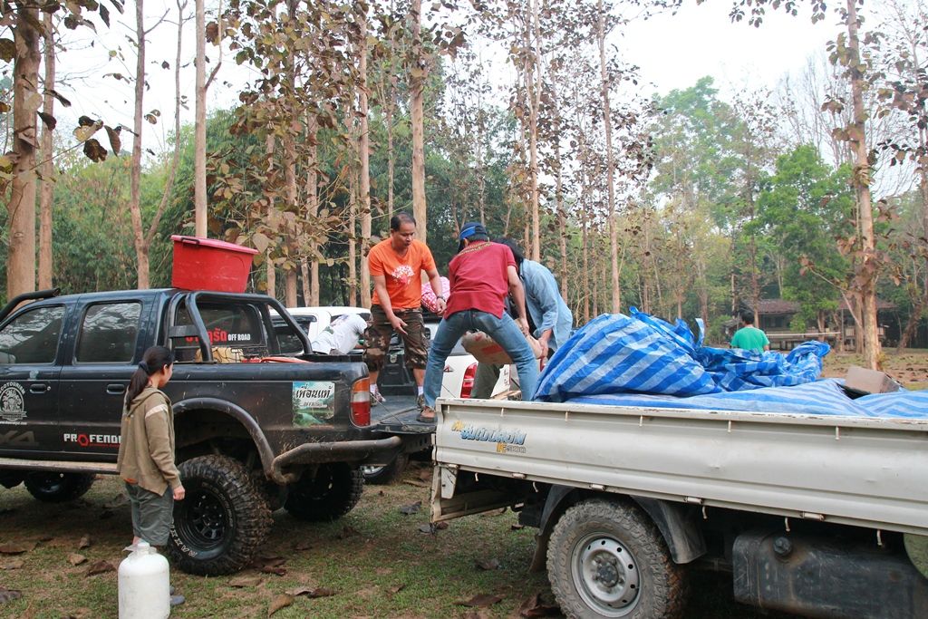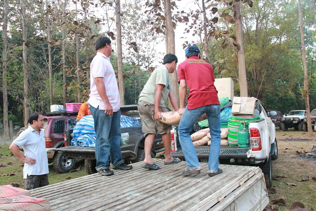 จัดถ่ายปูนซิเมนต์จากกระบะK (ที่อบตไล่โว่หรือหน่วยสะเนพ่อง) ขึ้นรถ 4WD มื้อเช้าที่ หน่วยสะเนพ่อง...