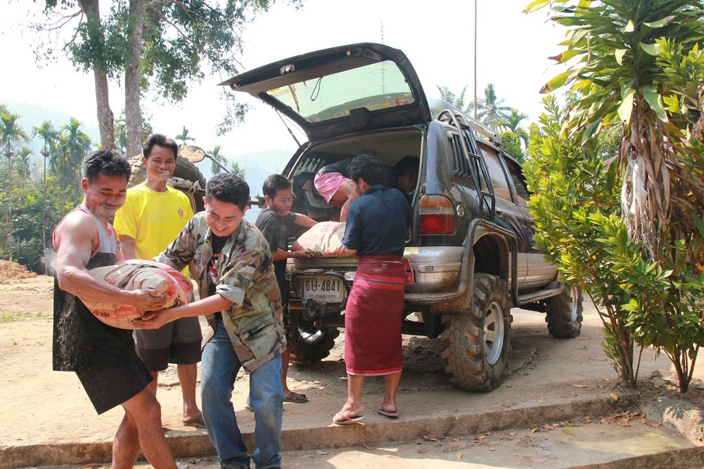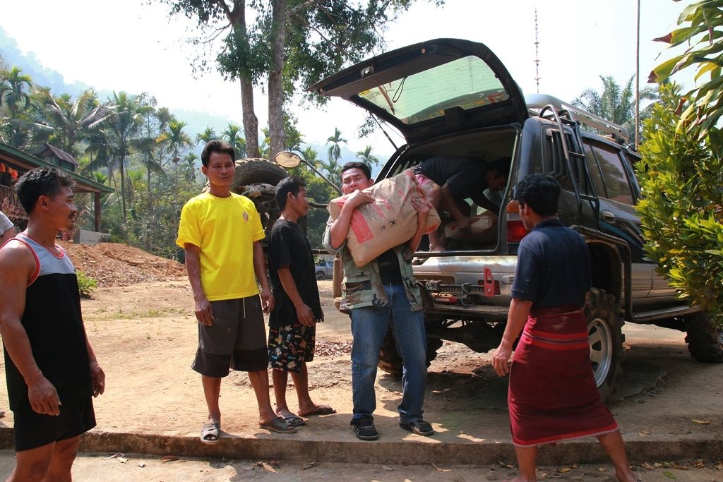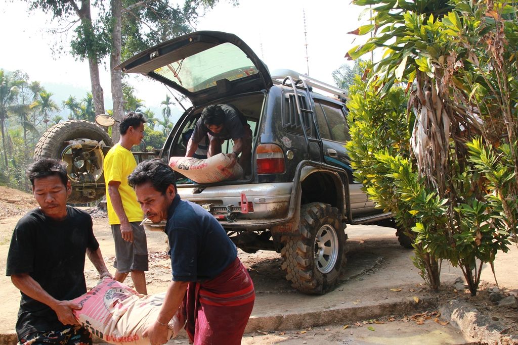 จัดถ่ายปูนซิเมนต์จากกระบะK (ที่อบตไล่โว่หรือหน่วยสะเนพ่อง) ขึ้นรถ 4WD มื้อเช้าที่ หน่วยสะเนพ่อง...