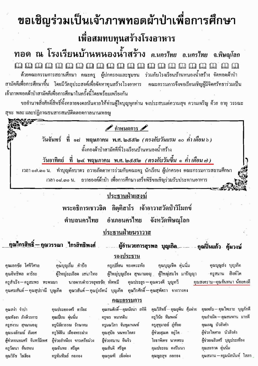 ขอรบกวนเพื่อน ๆ พี่ ๆ น้อง ๆ ให้ความอนุเคราะห์เด็กน้อย โดยโรงเรียนบ้านหนองน้ำสร้าง อำเภอนครไทย จังหวัดพิษณุโลก ที่ผมเป็นผู้บริหาร เป็นโรงเรียนขนาดเล็ก นักเรียนจำนวน 110 คน เปิดสอนตั้งแต่ชั้นอนุบาล 1 จนถึงชั้นประถมศึกษาปีที่ 6 อาคารสถานที่ทรุดโทรม โดยเฉพาะโรงอาหารนักเรียนซึ่งก่อสร้างมาร่วม 30 ปี ชำรุดทรุดโทรมมาก ขณะนี้คานบางตัวปลวกกินจนหักแล้ว เกรงจะเป็นอันตรายต่อเด็ก ๆ ผมและคณะครูจึงทอดผ้าป่าการศึกษา จัดหางบประมาณมาซ่อมแซม ซึ่งใช้เงินจำนวนมาก คำนวณแล้ว ประมาณเกือบ 200,000 บาท และโรงเรียนไม่ได้รับงบประมาณจากทางการเพื่อการนี้เลย โรงเรียน คณะครูจึงต้องช่วยเหลือตนเอง โดยจัดตั้งกองผ้าป่าการศึกษาและจัดเปตองการกุศลขึ้นในวันที่ 23 - 24 พฤษภาคม 2552 จึงขอเชิญชวนเพื่อน ๆ ร่วมบริจาค ทำบุญแก่เด็กน้อย ๆ ที่อยู่ห่างไกลด้วย ทั้งนี้ผมได้แนบรูปภาพมาพร้อมกันนี้ หวังว่าคงได้รับความอนุเคราะห์จากเพื่อน ๆ ตามแต่ศรัทธา หากประสงค์บริจาคกรุณาโอนเงินมายังบัญชีโรงเรียนบ้านหนองน้ำสร้าง บัญชีออมทรัพย์ ธนาคารกรุงไทย จำกัด (มหาชน) สาขานครไทยชื่บัญชี "กองทุนพัฒนาโรงเรียนบ้านหนองน้ำสร้าง" หมายเลขบัญชี 630-1-35499-0 ขอขอบคุณเพื่อน ๆ พี่ ๆ น้อง ๆ ทุกคนมา ณ โอกาสนี้เป็นอย่างยิ่ง