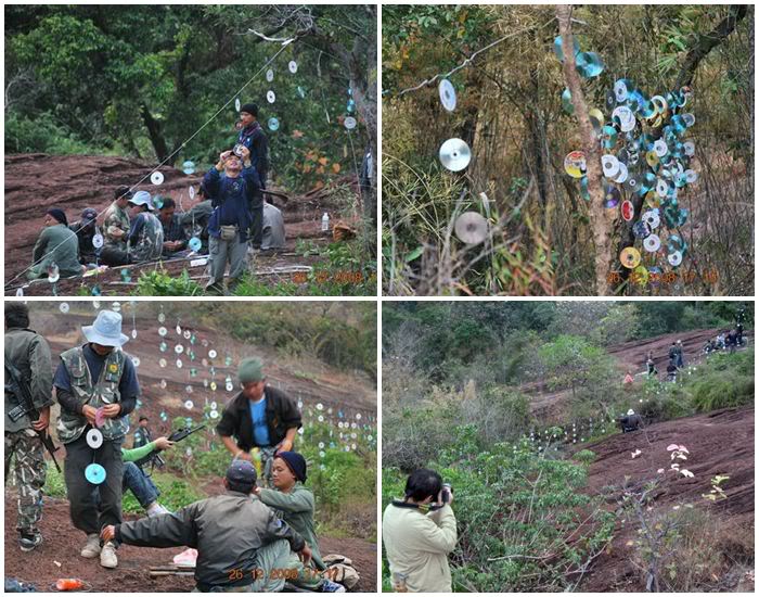 ทำรั้วด้วยแผ่นซีดีและแบตเตอรี่รถยนต์ 100แอมป์ เชื่อมกับสปอร์ตไลท์ที่แขวนไว้ระดับเดียวกับแผ่นซีดี
