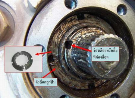 คำตอบที่ 3 แหวนล็อคหัวเพลาใช้ล็อคเพลาหน้าไม่ให้เพลาหลุดออกจากล้อครับมันจะมีระยะฟรี ล้อหน้าโยกได้ไม่น่าเกี่ยวกับแหวนล็อคหัวเพลาครับ ให้ดูที่ตัวล็อคลูกปืนล้อหน้าตามรูปครับ