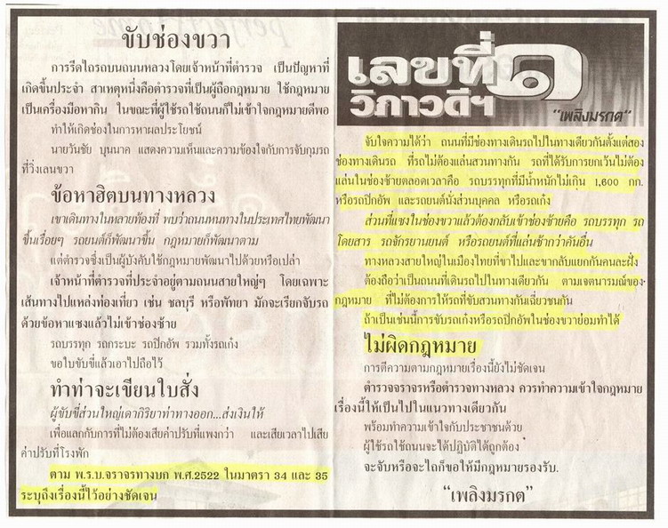 " มาตรา 35 รถที่มีความเร็วช้าหรือรถที่มีความเร็วต่ำกว่าความเร็วของรถคันอื่นที่ขับใน ทิศทางเดียวกัน ผู้ขับขี่ต้องขับรถให้ใกล้ขอบทางเดินรถด้านซ้ายเท่าที่จะกระทำได้