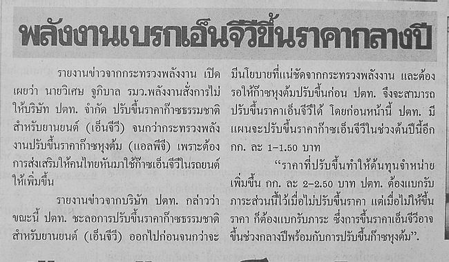 4.ทาง ปตท. จะให้แท็กซี่เปลี่ยนจากก๊าซ LPG เป็น NGV โดยออกค่าใช้จ่ายการติตตั้งให้ .. แต่ NGV มีอู่ติดตั้งได้ไม่กี่แห่งอุปกรณ์และถังก๊าซ ต้องสั่งเข้ามาจากต่างประเทศทั้งหมด ..คงต้องใช้เวลา 2-3 ปีกว่าจะเปลี่ยนได้หมด และตอนนั้นก๊าซ NGV ก็ตัองลอยตัวเพราะอุ้มไม่ไหวเนื่องจากกำหนดราคาของ NGV ไว้เท่ากับครึ่งหนึ่งของน้ำมันดีเซล ...