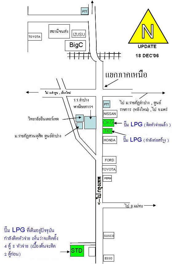 ท่านที่ขึ้นเหนือไม่ต้องห่วงแล้วครับ ขณะนี้ปั้มแก๊สที่ลำปางเปิดแล้ว 2 ปั้ม สมบูรณ์แบบแล้วและคาดว่าสิ้นปีนี้เปิดเพิ่มได้อีก 2 ปั้มครับ ไม่ต้องแย่งกันเข้าคิวรอนาน ระยะนี้หนาวมากครับ ขั้นมาทางเหนือเตรียมเสื้อกันหนาวมาด้วยนะครับ สวัสดีปีใหม่ล่วงหน้าครับ