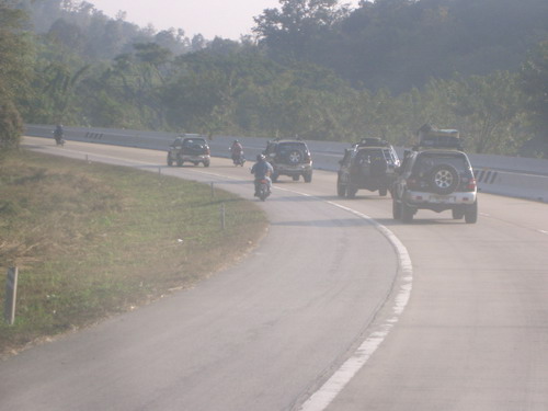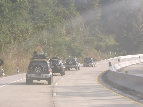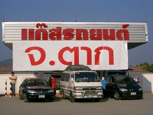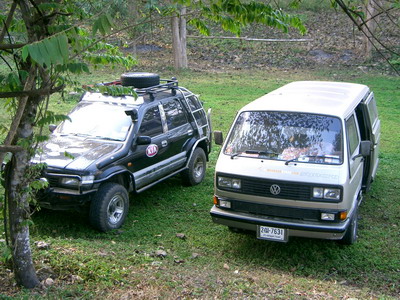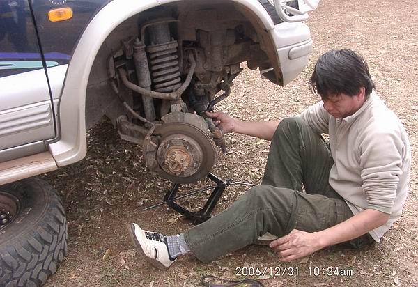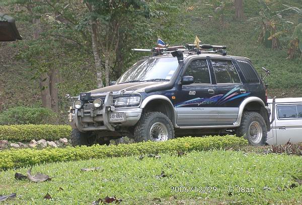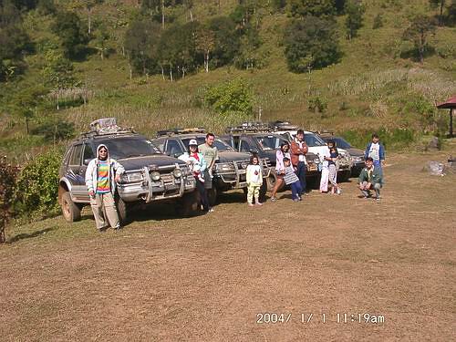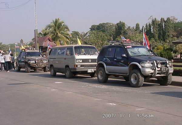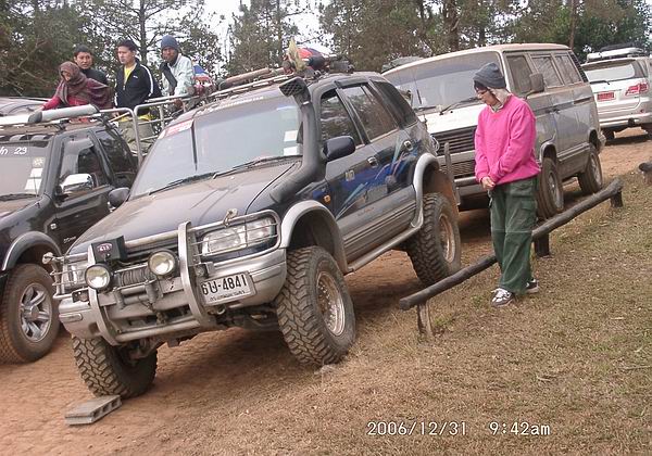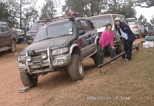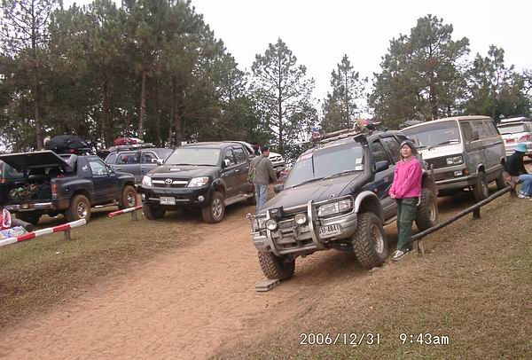 คำตอบที่ 54 ขึ้นดอยผ้าห่มปกได้ครึ่งทาง ลูกหมากคันชักคันส่งด้านขวาของรถยืนงงเกิดหลุดทำให้รถเบนออกข้างทางให้หวาดเสียว ต้องใช้วินช์ดึงรถให้เข้าที่ปลอดภัย แล้วจัดการซ่อมแบบชาวเขาโดยหม่อง WAR ใช้ฆ้อนตีอัดลูกหมากเข้าเบ้าเดิม แล้วเอาเชือกและยางในจักรยานมัดไว้ ..เดินทางต่อไปจนถึงลานพักบนดอยผ้าห่มปก แต่ต้องพบกับฝูงชนและรถมากมาย จนไม่มีทีจอด เลยต้องจอดแบบนี้ สปอร์ตเทจ และรถตู้เพียงคันเดียวที่ขึ้นดอยผ้าห่มปกได้
