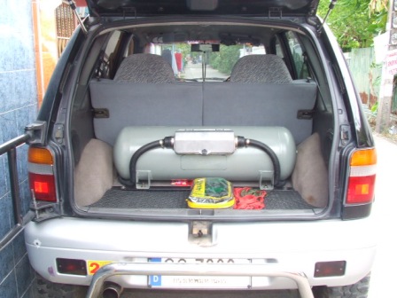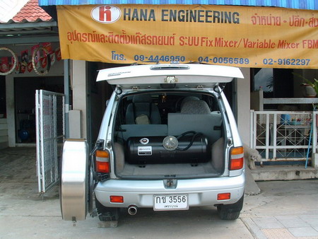 8.ติดแก็สถัง 64 ลิตรเป็นระบบ Fix mixer ได้ปีกว่ามีแบ็คไฟร์บ้างแต่ไม่มีเวลาไปหาช่าง เลยใช้แอร์โฟลว์ที่เสียใส่อยู่ ส่วนตัวดีเก็บไว้ฉุกเฉินท้ายรถ ไม่มีกล่องปิดถังแก็สครับ ว่าจะทำเป็นชั้นตะแกรงก็ไม่ได้ทำ..
