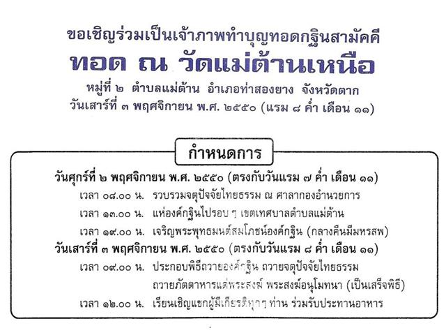 กำหนดการกฐินสามัคคีเพื่อนพันธมิตรชาวออฟโรด ถวาย ณ วัดแม่ต้านเหนือ