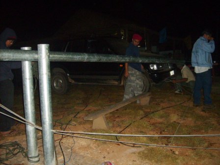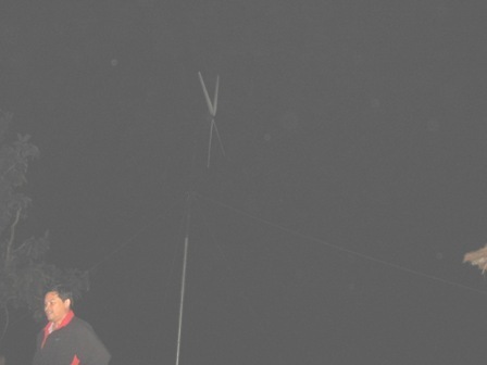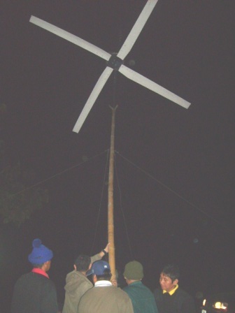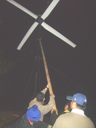 คำตอบที่ 79 ดึงกันกังหันขึ้นโดยตรงคงจะลำบาก เพราะแกนประคองสลิงแข็งแรงไม่พอ พี่ใหญ่เลยทำมุม3เหลี่ยมเพื่อให้เสากังหันประคองสายสลิงเอง เลยใช้รถลากขึ้นเป็นมุมสามเหลี่ยม (หัวแหลมจริงๆเลย)