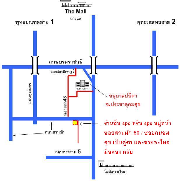 คำตอบที่ 1 สวัสดีครับ อู่อยู่ที่ถนนสวนผัก หน้าซอยสวนผัก 50 ชื่ออู่ SPC หรือ SPS นี่แหละครับ ตามแผนที่ครับ แฟนเจ้าของอู่ ชื่อคุณหลิน เป็นผู้หญิงครับ เจ้าของอู่เค้าจะอยู่ที่เชียงกงขายอะไหล่ บางทีก็อยูต่างประเทศ