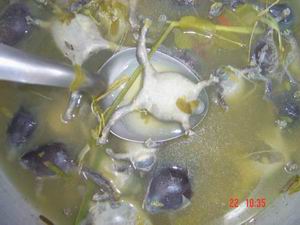 ทิ้งไว้สักครู่จนสุกแต่อย่าให้เปื่อยมาก นำขึ้นมาเอาเครื่องในออก นำไปใส่หม้อแกง
