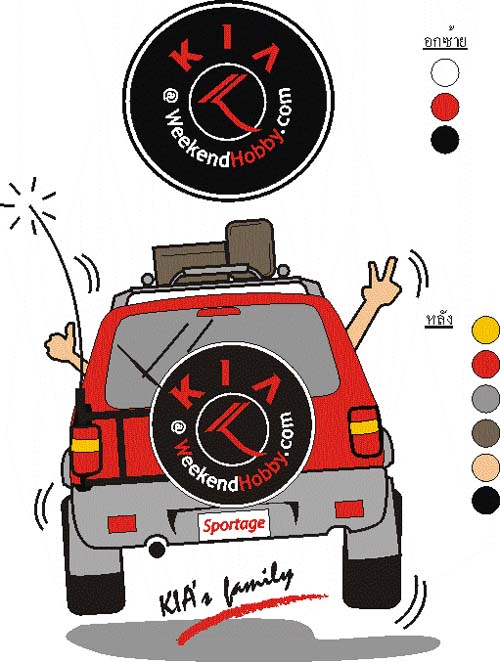 ตอนนี้ขอแสดงความคิดเห็นเรื่องเครื่องหมายโลโก้ ที่จะจัดทำผลิตภัณท์ที่ออกแบบมาให้ดู ว่าเป็นเครื่องหมายของ บริษัทเกียมอเตอร์ ซึ่งถ้าเข้าไปดูในโชว์รูมเขาจะมีผลิตภัณท์ เช่น กระเป๋า,เสื้อ,หมวก,เก้าอี้ปิกนิก ฯลฯ ใช้โลโก้แบบนี้ ซึ่งแต่เดิมมีความคิดกันว่าเกียวีคเอนฯจะไม่ใช้เครื่องหมายเหมือนเกียมอเตอร์ เพราะไม่มีความเกี่ยวข้องกัน เราเป็นเพียงผู้ซื้อผลิตภัณท์มาใช้และคอยช่วยเหลือกันในกลุ่มหากมีปัญหาเกิดขึ้น จากนั้นคุณ M:)ได้ช่วยออกโลโก้ มาให้เลือกจนสรุปได้แบบ สำหรับทำสติกเกอร์ติดรถที่ใช้จนถึงปัจจุบัน ส่วนอีกแบบ เป็นปีกตัวKอยู่ตรงกลาง และมี KIA @ weekendhobby.com ล้อมรอบเป็นวงกลม ไว้เป็นสัญลักษณ์ของชมรม