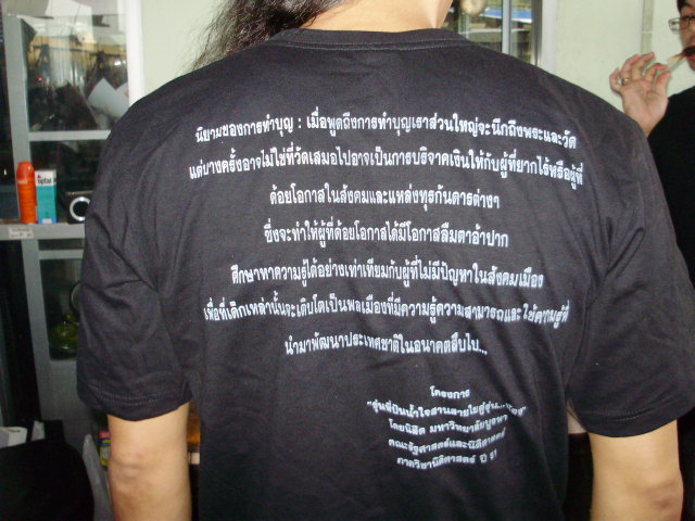 ปล.ทางคณะข้าพเจ้าได้ทำเสื้อขึ้นมาขายด้วย โดยขายราคาตัวละ200บาท ต้นทุน100บาท อีก100เข้าโครงการเพื่อซื้อของบริจาคให้กับเด็กๆ แต่ตอนนี้เสื้อยังไม่เสร็จ ถ้าเสร็จแล้วจะโพสให้ครับ ตอนนี้เชิญลงชื่อจองได้เลย