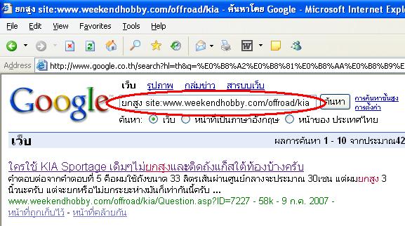 ตัวอย่าง ต้องการค้นหาคำว่า "ยกสูง" ใหพิมพ์ : ยกสูง site:www.weekendhobby.com/offroad/kia