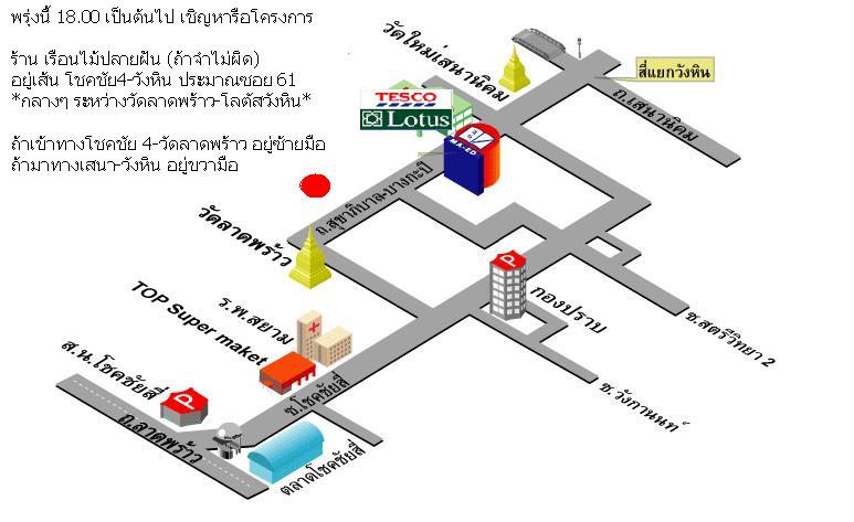 คำตอบที่ 49 พรุ่งนี้ 18.00 เป็นต้นไป เชิญหารือโครงการ ร้าน เรือนไม้ปลายฝัน (ถ้าจำไม่ผิด) อยู่เส้น โชคชัย4-วังหิน ประมาณซอย 61 *กลางๆ ระหว่างวัดลาดพร้าว-โลตัสวังหิน* ถ้าเข้าทางโชคชัย 4-วัดลาดพร้าว อยู่ซ้ายมือ ถ้ามาทางเสนา-วังหิน อยู่ขวามือ