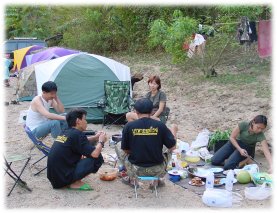 ...เต๊นท์หลากสีถูกจัดกางขึ้นริมลำธาร ที่ได้จากการคำนวนว่าปลอดภัยจากน้ำป่า กิจกรรมต่างๆได้ผลุดขึ้น "ผัดกูดที่นี่เยอะนะ" เป็นเสียงจาก