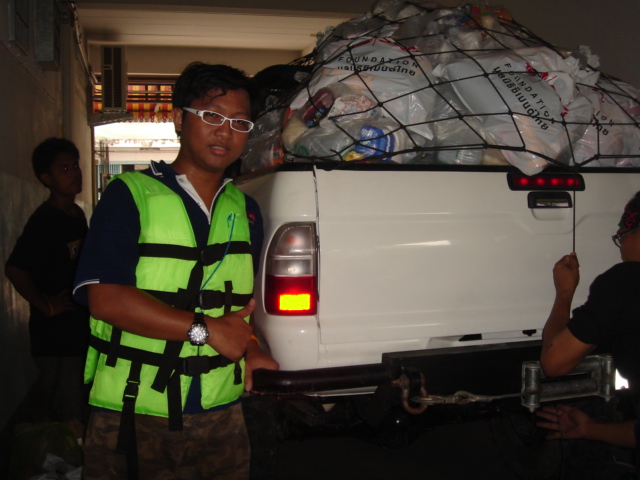 แบ่งน้ำและถุงยังชีพบางส่วน ให้อบต.บ้านเกาะ เผื่อเอาลงเรือไปช่วยเหลือให้หมู่บ้านต่อไป