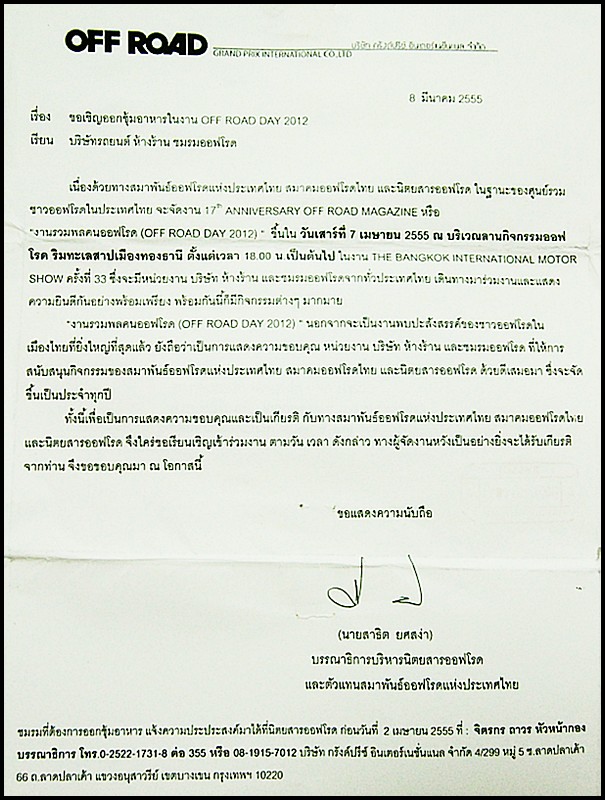 เนื่องจากเมื่อวานนี้3เมษายน2555 ประธานได้โทรมาบอกผมว่าได้พูดคุย และปรึกษากับทางทีมงาน(ของท่านประธาน)เห็นควรว่าไม่ขอร่วมงาน"รวมพลคนออฟโรด"OFF ROAD DAY 2012