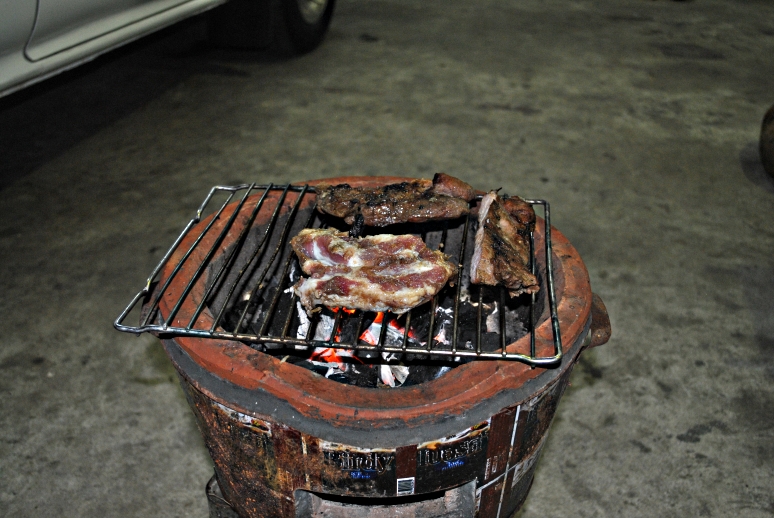 Holl กำลังก่อไฟย่างหมู ฝนก็เทลงมา เลยต้องย้ายไปต่อกันที่บ้านพี่ศร