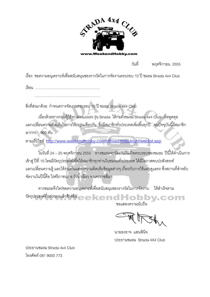 เพื่อนๆ ท่านใดที่มี หรือใช้บริการ ที่เกี่ยวกับรถ ต้องการจดหมายในการขอ ผู้ร่วมสนับสนุน สปอนเซอร์ ในงานครบรอบ 10 ปี ของคลับเรา