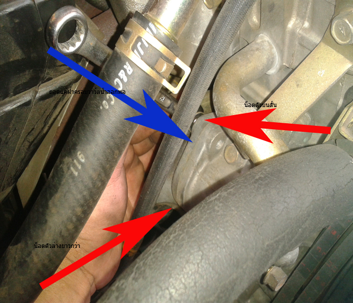 อีกรูปครับเสื้อ หรือ ฝาครอบ วาว์ลนํ้า หรือ thermostat เครื่อยนต์ร้อนถอดยากนิดหนึ่ง หลังมือติดกับท่อร่วมไอเสีย จี๊ดๆเลยร้อนนน