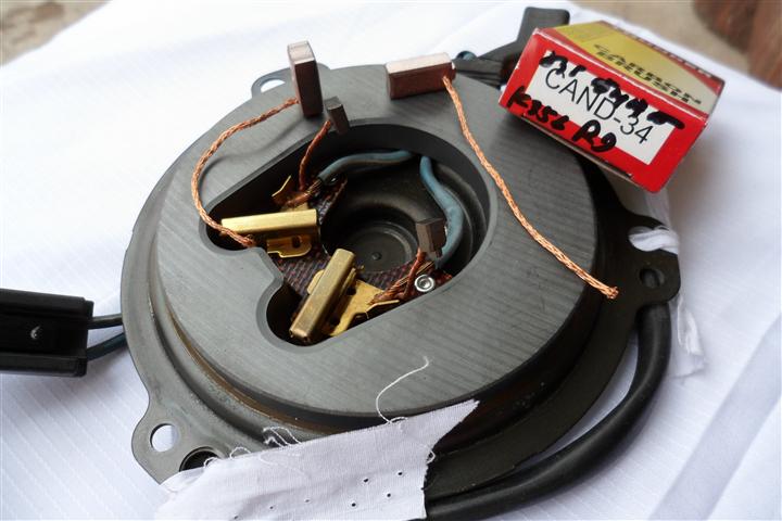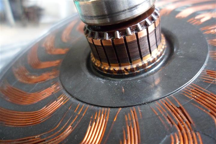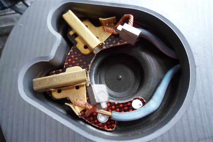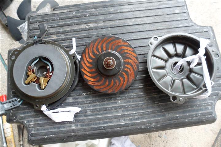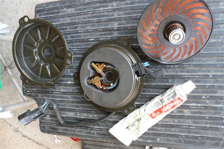 แยกชิ้นส่วนของมอเตอร์ ปรากฎว่าแปรงถ่านสึกหมดครับ และทำความสะอาดโดยล้างส่วนที่เป็นครอบด้วยผงซักฟอกและน้ำ แล้วเป่าลมให้แห้ง (ระวังมีแหวนกันรุนพลาสติกด้านละตัวหายนะครับ) ส่วนตัวโรเตอร์ใช้วิที่เช็ดแลเป่าลมเอา อย่าไปล้างน้ำหรือน้ำมันเพราะมันจะเข้าไปในลูกปืน เดี๋ยวลูกปืนพังอีกครับ