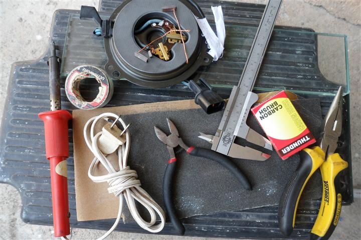 อุปกรณ์ เครื่องมือที่เกี่ยวข้องกับการฝนแปรงถ่านครับ มีกระจก กระดาษทรายเบอร์ 180 เครื่องมือวัด หัวแร้ง ดีบุกบัดกรี คีนตัด