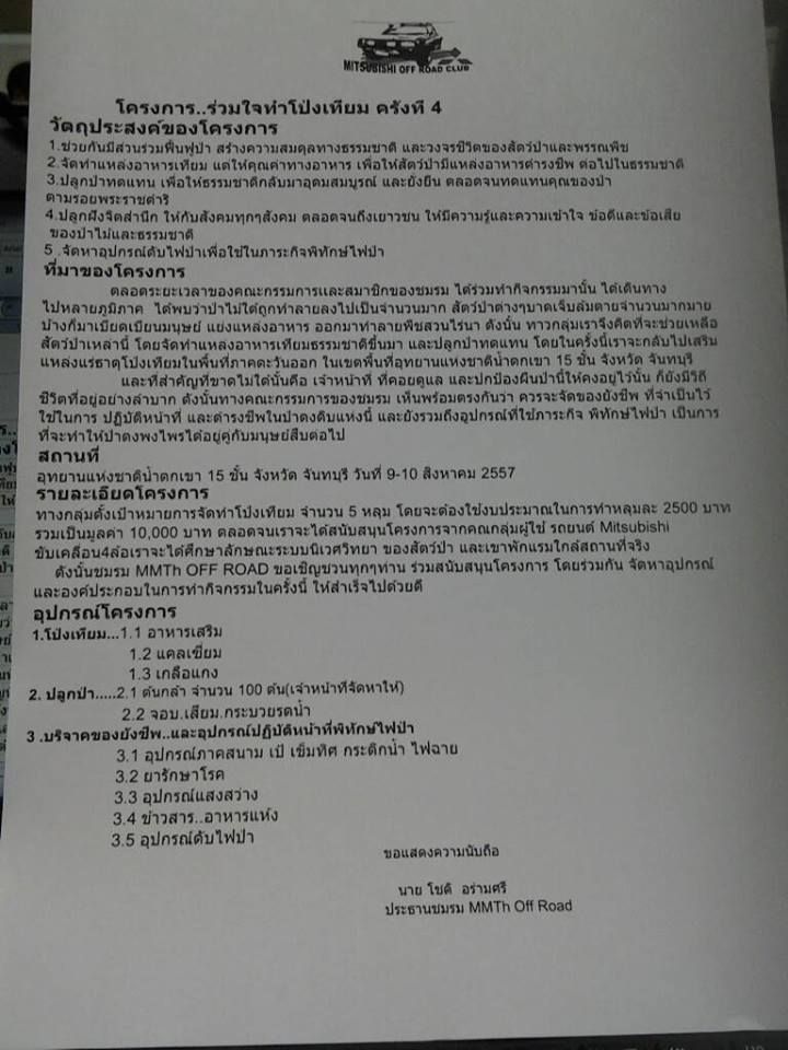 ในการจัดทำชุดดับไฟป่า บริจาคให้เจ้าหน้าที่รักษาป่า และจัดทำโป่งเทียมให้สัตว์ในป่า