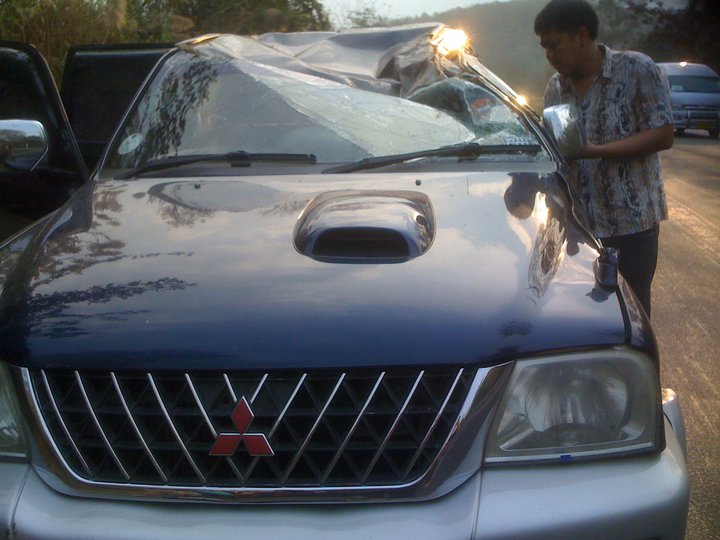 พอตำรวจมา ก็ถามผมว่า ปลอดภัยดีน่ะครับ และก็มีเพื่อนร่วมทางที่ผ่านไปผ่านมาเข้ามาให้ความช่วยเหลือรู้สึกปลื้มใจจริง ๆ แต่ดั้นมีไอ้ชั่วสองตัวขี่มอเตอร์ไซด์ผ่านมาตอนที่รถหงายท้องอยู่ ถามผมว่า คนขับอยู่ไหน ผมก็ตอบว่า ผมนี่แหละคนขับ มันก็อุทานออกมาว่าไม่เป็นอะไรเลยเหรอ ทำนองว่าไม่ตายเหรอประมาณนั้น และก็เดินสำรวจตั้งแต่จุดเกิดเหตุมาจนถึงจุดสิ้นสุดประมาณ 100 เมตร วนดูรอบ ๆ รถ มันก็ขโมย GPS ผมไป ช่วงที่เราเผลอคุยกับคนที่เค้ามาให้ความช่วยเหลือ ที่รู้เพราะว่าหลังจากเก็บกู้เรียบร้อยแล้วมี GPS อันเดียวที่หายไป ทั้ง ๆ ที่ผมเดินหาละเอียดถี่ถ้วนแล้ว