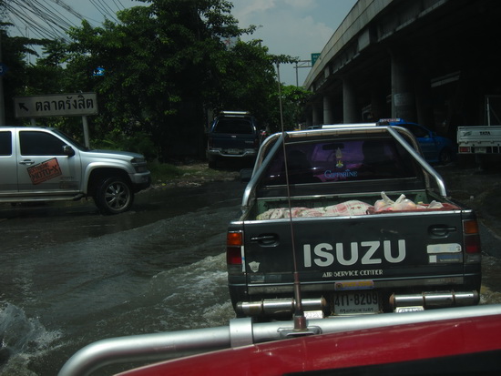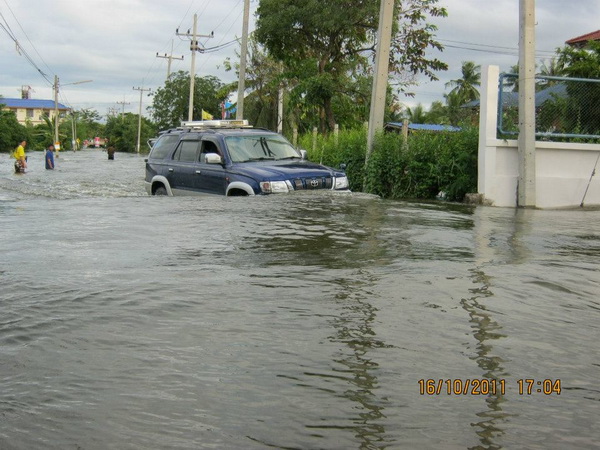 วันนี้(๑๙ ตค. ๕๔)ไปภาระกิจแถว ๆ วัดบัวแก้ว ต.ระแหง ลาดหลุมแก้ว ปทุมธานี วิ่งฝั่ง รพ.ลาดหลุมแก้ว เลนติดเกาะกลาง ขากลับ ๑๓.๐๐-๑๔.๐๐ น้ำประมาณครึ่งล้อ ๒๖๕ -๗๕-๑๖ ประมาณหน้าแข้งผม แน้วโน้มน่าจะสูงขึ้น แต่ในใจยากจะให้แห้งไปเลยดีกว่า