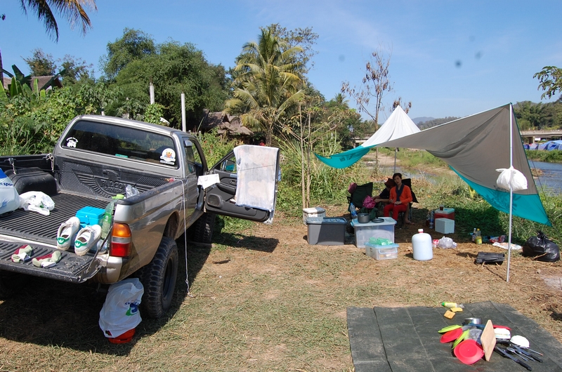 แดดเริ่มมาตอนประมาณเก้าโมงเช้า พี่หนึ่งเลยเอาฟลายชีทออกมากางกันไว้ก่อน เพราะตรงที่เราพักไม่มีร่มเลย