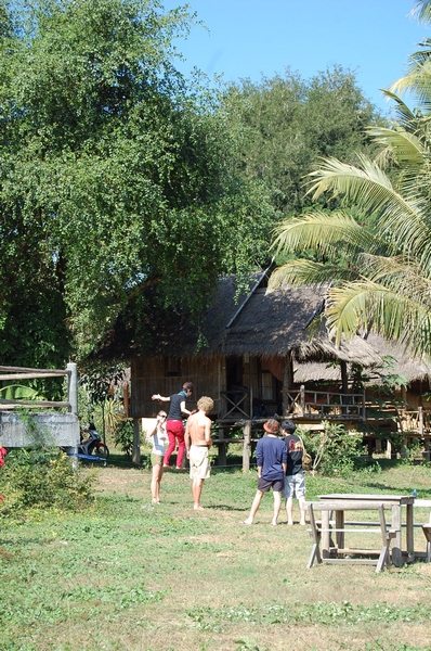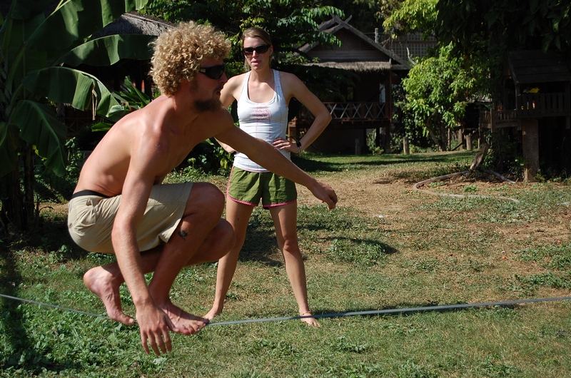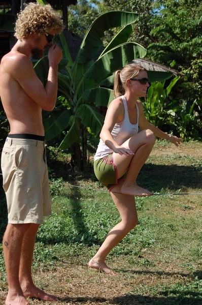 ฝรั่งที่ รีสอร์ทข้าง เค้าฝึกเดินบนเชือกพี่ไก่เห็นก้อเลยเข้าไปคุย แล้วก้อขอลองเล่นกับเค้าดู