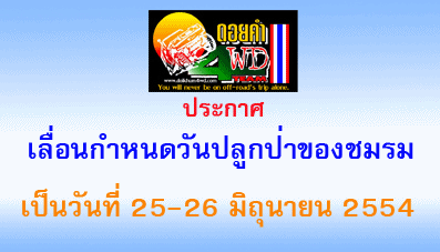 พี่หนานยศครับ ทางประธานดอยคำออฟโรดเพิ่งแจ้งมาว่าขอเลื่อนวันปลูกป่าออกไปเป็นว้นที่ 25-26 มิย 54 ปลายเดือนครับ เพราะสมาชิกบางคนติดงานแข่งรถออฟโรดที่แพร่ ครับ