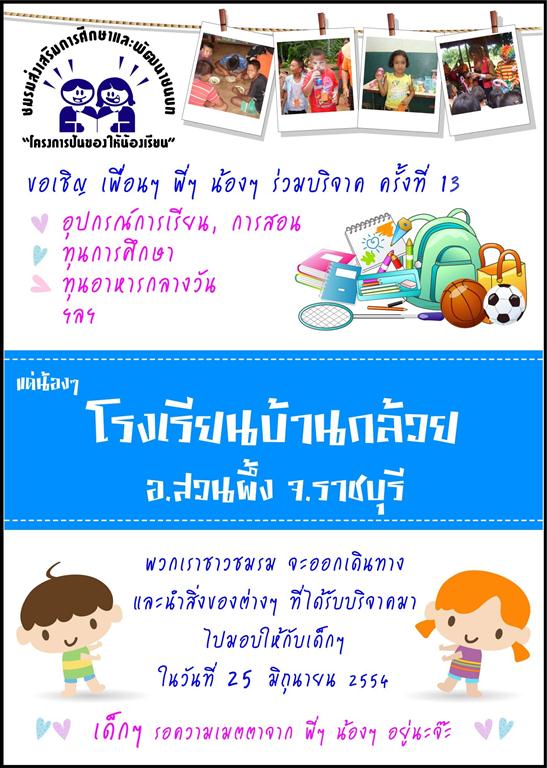 แล้วได้แจ้งทางอาจารย์ ให้ทำจดหมายมาถึงผม ถึงความต้องการที่อยากจะได้อะไร ซึ่งผมก็ต้องดูกำลังของพวกเราด้วยว่า สามารถให้กับทางโรงเรียนได้แค่ไหน
