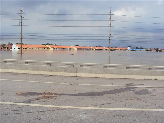 > เรือน ที่อู่อีกฝั่งที่น้ำท่วมมิด ประมาณ 1.1/2 ชั้น ของบ้านที่ยังไม่ออกมา ซึ้งบางบ้านต้องย้าย ขึ้นไปบน