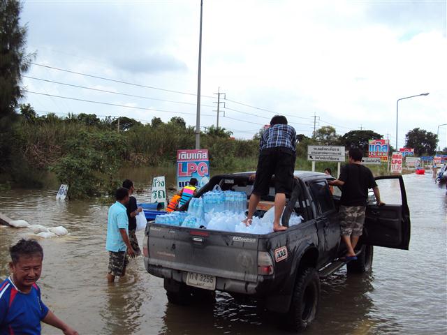 มาคอยดักรถเพื่อขอของบริจาค แล้วก็กรูกันเข้ามาหยิบสิ่งของต่างๆ ที่เราเตรียมไปช่วยเหลือ โดยใช้เวลาเพียงแป๊บเดียวหมดรถเลยครับ(เหมือนถูกปล้นยังงัยไม่รู้) ยังงัยแล้วหากเราตั้งใจจะไปที่ไหนเป็นเป้าหมายแรกเราควรใจแข็งซักนิดแล้วไปให้ถึงจุดหมายก่อน แล้วค่อยไปช่วยจุดอื่น เมื่อวานกว่าจะไปถึงบางปะหัน เหลือของนิดเดียวเอง(ทั้งหมด 9 คันลุยน้ำไปได้แค่ 4 คัน) อันนี้เป็นข้อมูล ณ ขณะนี้ครับ
