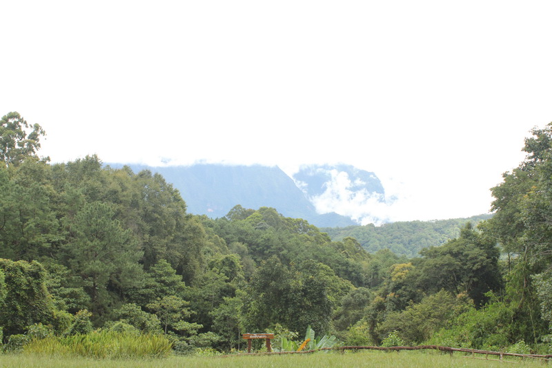 เดินลงมายังจุดกางเต้นท์ที่มีดอยหลวงเชียงดาวเป็นฉากหลัง แต่วันนี้มองไม่เห็นเมฆและหมอกหนามาก