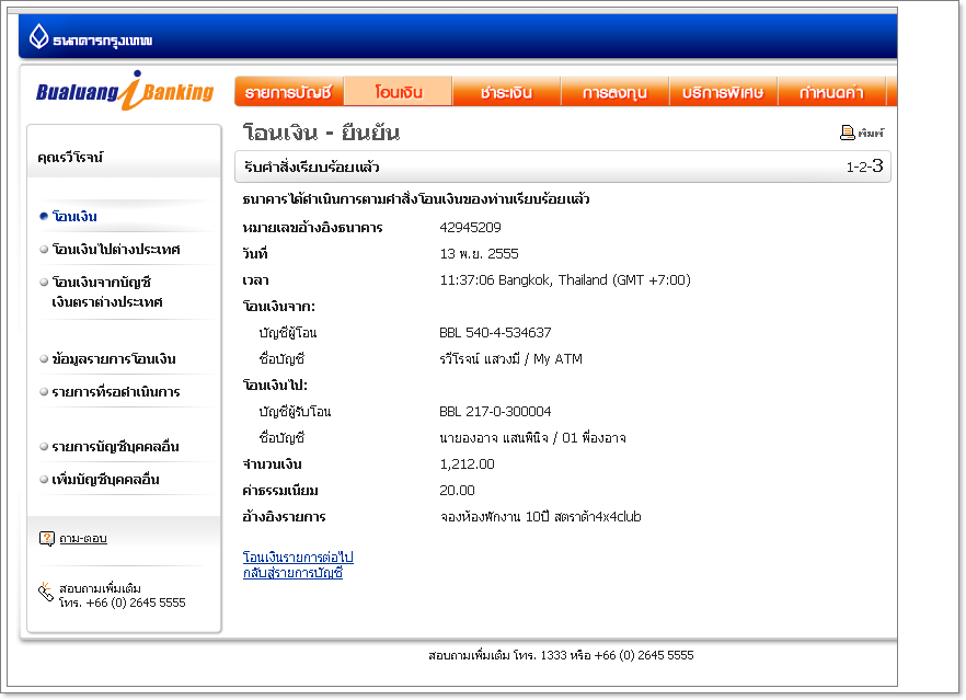 วันที่ ๑๖ พ.ย. ๕๕ เวลา ๑๕.๒๕ น. จำนวน ๑,๒๐๐ บาท