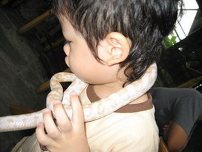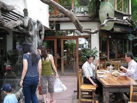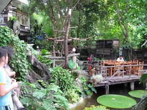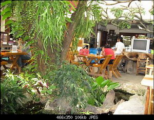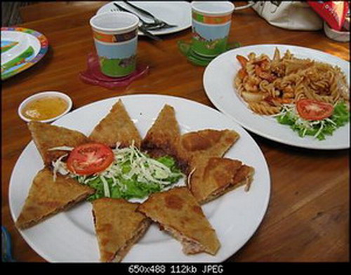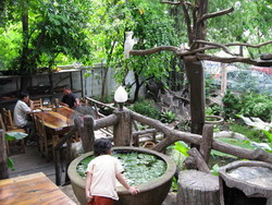 สำหรับอาหารร้านนี้จัดเป็นอาหารธรรมดาไม่แปลกหรือพิสดาร แต่สำคัญตรงรสชาติอาหารที่กลมกล่อมเข้ากันได้ดี ด้วยวันที่ไปนี้มีพ่อลูกชาย 2 หน่อกับผมแลภรรยา รวมสมาชิก 4 คน จึงลงมติกันว่าจะสังอาหารที่รสไม่จัดนักเผื่อเด็กๆ ส่วนอาหารที่ผมสั่งมาทานจานแรก ตะวันรามอินทรา จานนี้กรอบนอกนุ่มในเขาเอากุ้งมาห่อแป้งแล้วทอดรสชาติถูกปากเด็กๆ มาก ตามด้วยมักกาโรนีผัดกุ้ง อันนี้ขอลงความเห็นเลยว่าหอมเนยแต่ไม่เลี่ยนรสดี และที่น่าแปลกใจคือ ข้อไก่ทอด ขอที่นี่กรอบมากๆ เคี้ยวเพลินกินไปบ่นไปหมดไป 2 จาน ยังมี ห่อหมกปลา ที่ปลาเขาไม่คาวเลย ส่วนจานที่ภรรยาผมดูจะชอบมากรู้สึกจะถูกปากคุณผู้หญิง คือ ยำคะน้ากรอบ โดยเขาเลือกเอาคะน้าอ่อนนำมาแช่น้ำแข็งราดด้วยน้ำยำรสแซ่บคลุกด้วยเนื้อหมูหมักนุ่มๆ อื่ม ! ชิมแล้วต้องยกหัวแม่มือกันเลยทีเดียว มีข้อติอยู่นิดหนึ่งก็เจ้าโต๊ะอาหารนี่สิดูเล็กไปซักนิด แต่ก็ไม่เป็นไรเพราะเด็กไม่ค่อยอยู่ติดโต๊ะกันเท่าไร เดี๋ยวขอวิ่งไปดูลิงบ้าง แมวดาว นกต่างๆ บ้าง ที่สำคัญมีสัตว์มากแต่ที่นี่ไม่มีกลิ่นเหม็นกลิ่นสาปของสัตว์ต่างๆ ที่เขาเลี้ยงเลยครับ