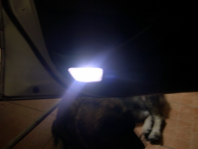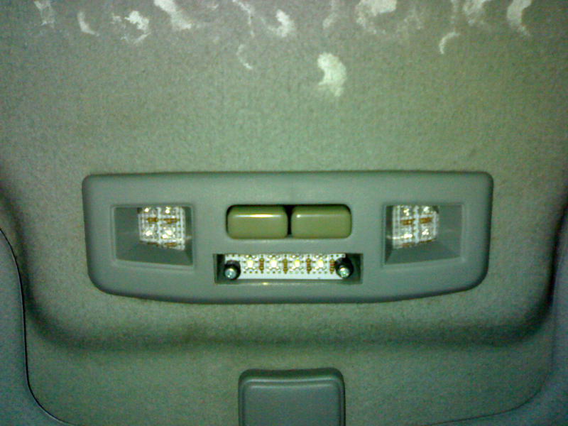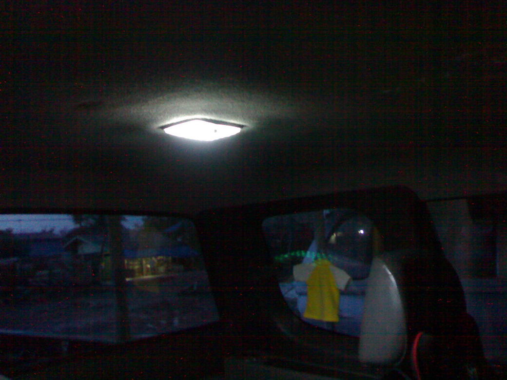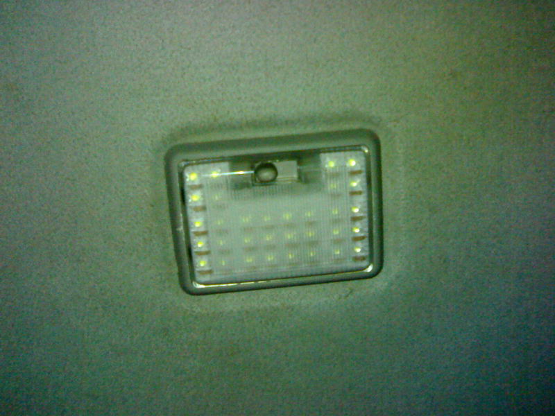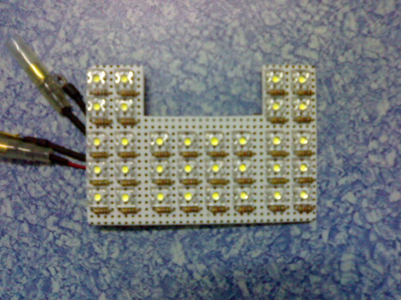 รูปแรกภาพไม่ค่อยจะชัดนะครับ ถ่ายจากมือถือเอาครับ ผมใช้ LED แบบสี่ขา จำนวน นับเอาตามรูปเลยนะครับ โดยใช้ R ขนาด 1K ขนานครับ หาซื้อหบอด LED เลือกที่มีราคาสักหน่อยนะครับ สีของหลอดจะได้เหมือนกัน เพราะถ้าซื้อแบบถูกทั่วไป หลอดจะไม่ใช่ขาวนวล แต่อาจจะเป็นขาว-ม่วง ขาว-ฟ้า หรือ ขาว-เหลือง เคยเจอมาแล้วครับ ถ้าทดสอบหลอด LED ที่ละดวงจะดูไม่ค่อยออก แต่ถ้าพร้อมกันทั้งหมดจะเห็นได้เต็มเลยครับ พอบัดกรีทุกอย่างเรียบร้อยแล้วก็จัดการทดสอบสะหน่อย หลังจากนั้นก็ยัดเข้าไปในโคมไฟเดิม แต่โคมไฟเดิมที่ผมใช้มีการตัดออกบ้าง เพื่อให้ลง LED ได้มากขึ้น