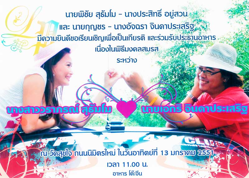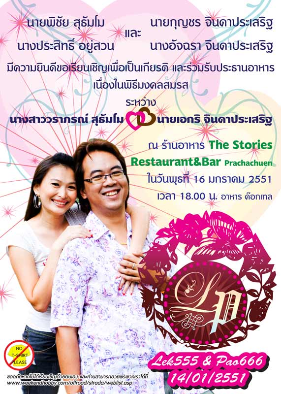 ขอเชิญมิตรสหายร่วมแสดงความยินดีกับคุณเล็กและคุณเป๋า เนื่องในพิธีมงคลสมรส