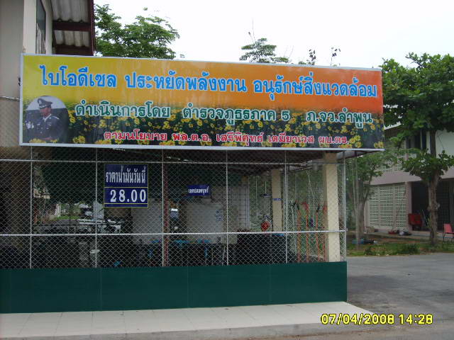 ตอนนี้ทางสำนักงานตำรวจ ตรงทางเข้าสำนักงานประกันสังคมลำพูน ได้มีการจัดตั้ง ปั้มไบโอดีเซลขึ้นมา