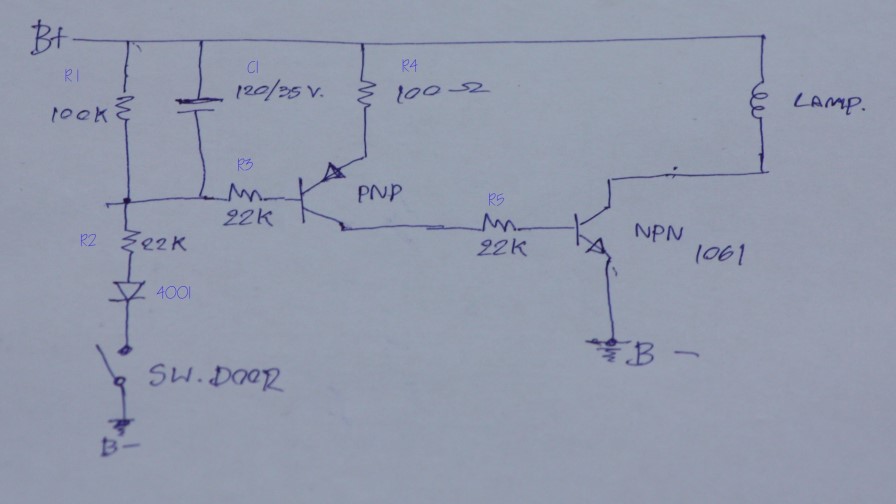 TR ตัวแรกเป็นแบบ pnp เบอร์อะไรก็ได้ รับสัญญาณจาก สวิทช์ประตู แล้วส่งกระแสเข้าขาBของ TR H1061เป็นตัวไดร์หลอดไฟ