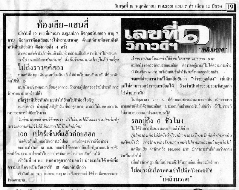 มันคิดเงินทุกอย่าง ทุกอย่างจริงๆ หมอและพยาบาล มาช่วยดูกันหลายคน อย่าดีใจไปว่าบริการดีนะ หมอและพบาบาลบางคนมาดูเฉยๆ ไม่ได้มาทำอะไรเลย ก็คิดเงิน