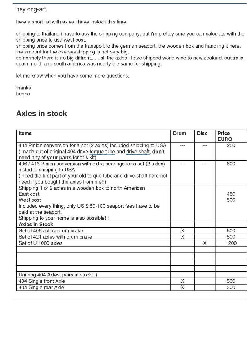 คำตอบที่ 19 http://cgi.ebay.com/ebaymotors/Unimog-404-Front-and-Rear-Axle-used_W0QQcmdZViewItemQQ_trksidZp3286Q2em20Q2el1116QQhashZitem220394545514QQitemZ220394545514QQptZMotorsQ5fCarQ5fTruckQ5fPartsQ5fAccessories#paymentmethods พอจะมีใคร เคยสั่งของ ebay บ้าง หรือใครทำ shipping บ้าง อยากให้สั่งให้น่ะ