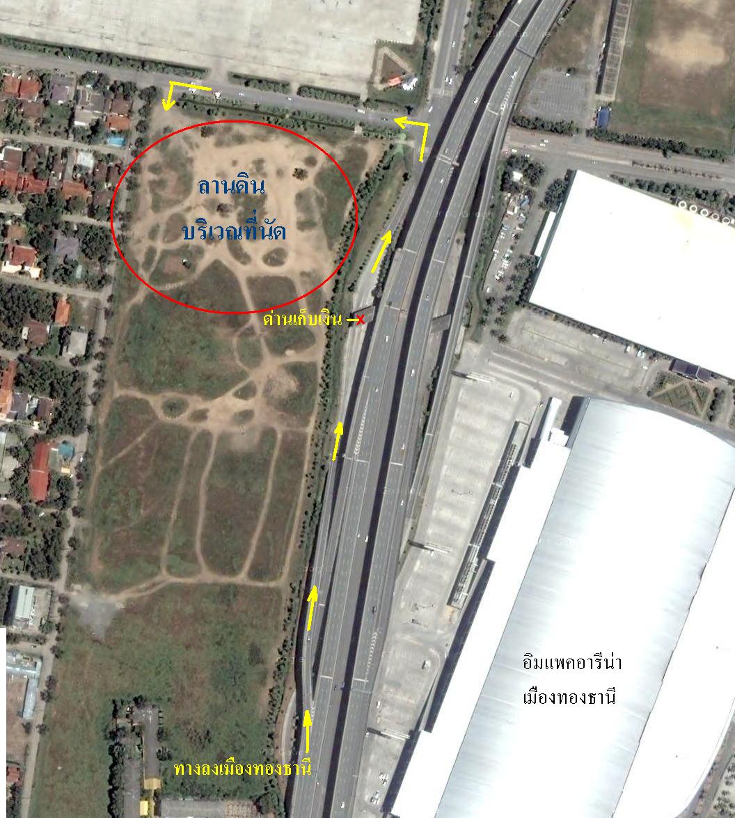 คำตอบที่ 90 มาจากทางไหนพี่ ถ้ามาจากในเมือง ผ่านทางลงแจ้งวัฒนะ แล้ว สังเกตุป้ายทางลง เมืองทองธานี ลงเสร็จแล้วผ่านดานเก็บเงิน เจอสี่แยก เลี้ยวซ้าย สังเกตุทางซ้ายมือ เป็นลานดิน วิ่งตามลูกศรเลยครับ